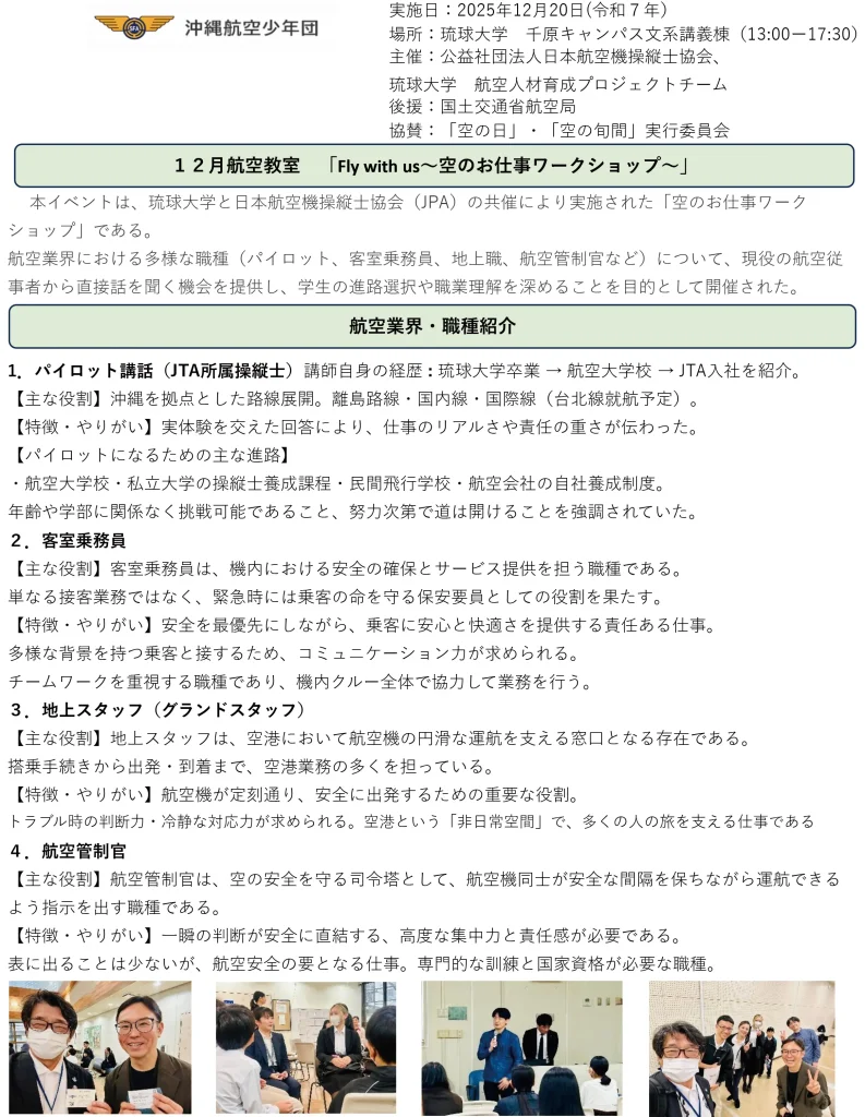 沖縄航空少年団 2025年12月広報 2026 2/06 活動報告 December 20, 2025February 6, 2026 活動報告 よかったらシェアしてね! URLをコピーしました! URLをコピーしました! 沖縄航空少年団 2025年10月広報 沖縄航空少年団 2026年1月広報 関連記事 沖縄航空少年団 2026年1月広報 February 2, 2026 沖縄航空少年団 2025年10月広報 December 3, 2025 沖縄航空少年団 2025年9月広報 (航空測候所) December 3, 2025 沖縄航空少年団 2025年9月広報 (動物植物検疫所) December 3, 2025 沖縄航空少年団 2025年8月広報 October 11, 2025 沖縄航空少年団 2025年6月広報 August 29, 2025 沖縄航空少年団 2025年5月広報 August 28, 2025 沖縄航空少年団 2025年4月広報 August 28, 2025 コメント コメントする コメントをキャンセルコメント ※ コメントは日本語で入力してください。(スパム対策)名前 ※ メール ※ サイト 次回のコメントで使用するためブラウザーに自分の名前、メールアドレス、サイトを保存する。 CAPTCHA コード 私はロボットではありません。 email confirm* post date* 日本語が含まれない投稿は無視されますのでご注意ください。(スパム対策)
